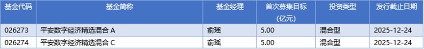 (1)12月23日新发基金共有2只,主要为混合型基金,其中平安数字经济精选混合A募集目标金额达5.00亿元;基金分红29只,多为债券型,派发红利最多的基金是平安广州交投广河高速公路封闭式基础设施证券投资基金,每10份基金份额派发红利2.2000元。