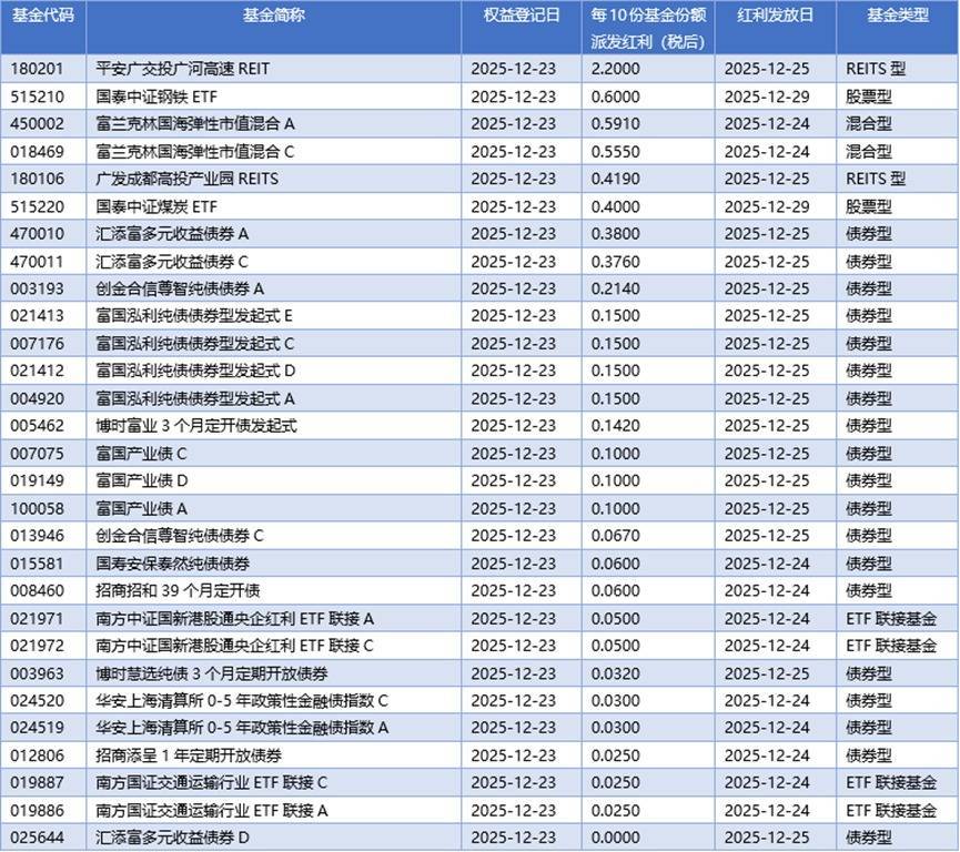四、12月23日基金分红一览