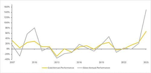 然而,高盛团队也注意到,金银比的崩溃掩盖了黄金在2025年的卓越表现(+67%),黄金仍然是那些寻求分散美元风险人士的首选替代投资工具。