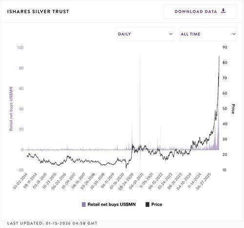 值得注意的是,Vanda数据显示,当前白银交易活跃度——目前为其3个月平均水平的2.1倍,在零售动能和“异常”资金加速流入方面,已超越黄金和加密货币。