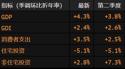 美国经济分析局周二发布的报告显示,第三季度经通胀调整后的国内生产总值折合年率增长4.3%。这一数字高于接受彭博调查的经济学家中除一人之外其他所有人的预期,也高于第二季度3.8%的增长速度。